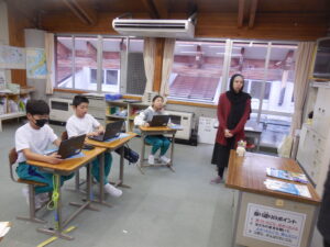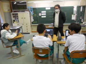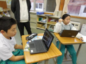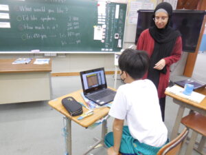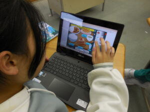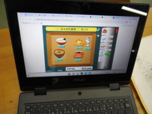 タブレットを使って、二人でやり取りをしてメニューを聞いたり選んだりする練習をしました。そのあと、「ひばり野小学校のランチメニューを1,500円以内で作る」がミッションです。どんなメニューになるか、予算内に収まるか、楽しみながら会話をして学習しています。