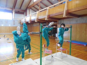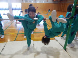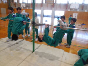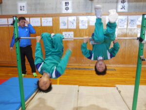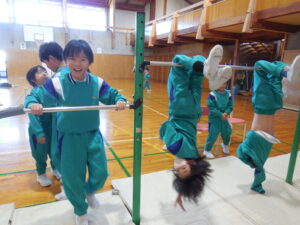体育の時間は、鉄棒&なわとびです。逆上がり練習では、紐を腰に巻いて体が鉄棒から離れないようにして工夫して練習していました。「あと少しなんに」と言いながら何度も挑戦する熱い子供たちがたくさんいます。また、高い鉄棒でビュンビュンこうもりをしたり、じゃんけんをしたりして運動を楽しんでいます。鉄棒に疲れたらなわとびをするというように、時間を上手に使っています。