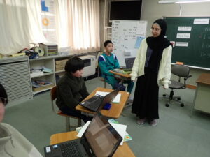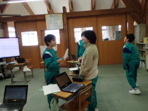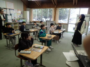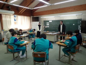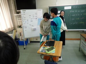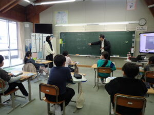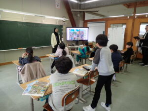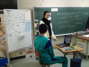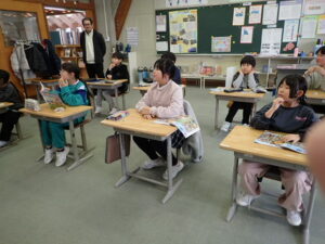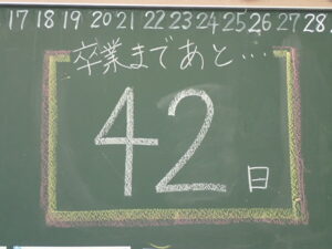6年生は「将来なりたいものとその理由を伝えよう」の学習です。中学校の先生にも送るそうなので真剣です。最初はALT のナディア先生と伝え合いました。そのあと、ペアになって交流しました。「cook(調理人)」「illustrator(イラストレーター)」「singer(歌手)」「farmer(農家)」などなど、英語で文章を書くことも練習を積んでいます。中学校入学が近付いていますね。教室の背面黒板には・・・。