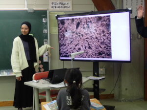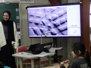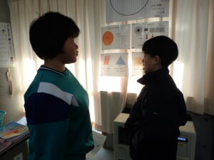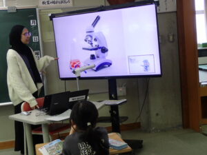 外国語活動はクイズです。”What’s this?”I’ts~.”の表現を練習しました。ナディア先生がテレビの画面に、顕微鏡のようにズームした映像を見せ、それが何かを当てます。オレンジやスポンジこれは簡単だったようです。一番難しかったのは、消しゴム。ズームすると本当にわかりづらいものでした。クイズ形式で楽しみながら表現に慣れていきました。