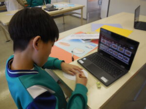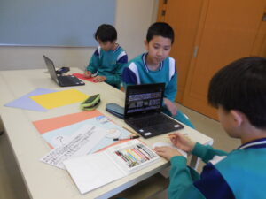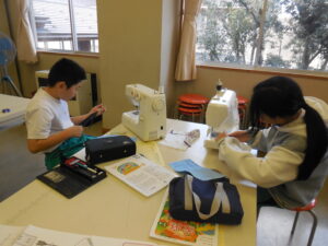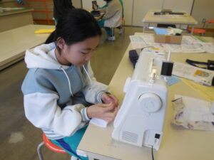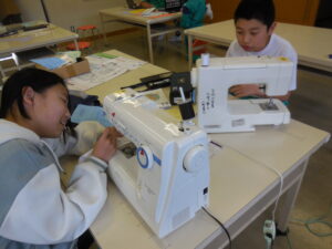 5・6年生の家庭科の時間です。5・6年生は合同で家庭科の授業を行っています。5年生はミシンの学習です。糸をかける順番に苦戦しながら直線縫いに取り組んでいます。6年生は、1月最終週の給食週間に向けて「リクエスト給食」の提案を考えています。家庭科で学んだ栄養バランスや全校の好みを考えながら献立を考え、ポスターを制作中です。同じ家庭科室ですが、それぞれ自分たちの学習に集中しています。