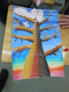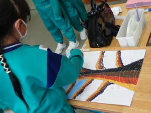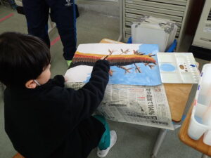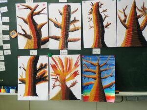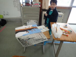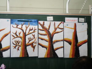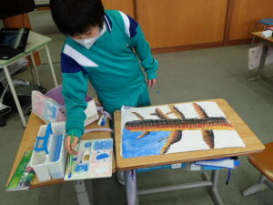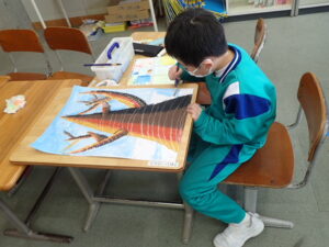 彫刻刀の使い方をしっかり学んだ3・4年生。いよいよ版画の下絵を掘り始めました。下絵を板に写し、彫る線を確認してから始めました。指を彫らないように気を付けます。彫刻刀で掘り進む前方に手を置かない、に気を付けて彫っていました。彫って刷ったイメージが捉えにくいのですが、福澤先生のスーパー指導によりきっと素晴らしい作品になると思います。子供たちも彫刻刀で彫るのを楽しんでいます。