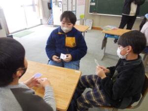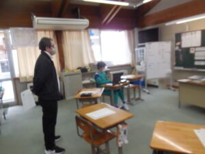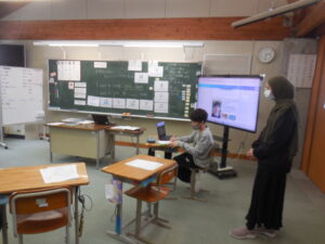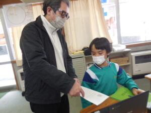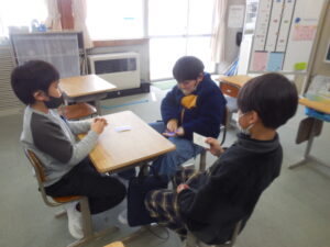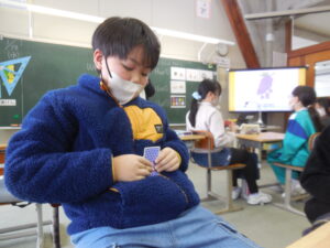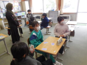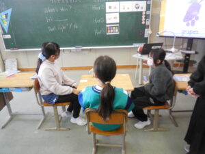 3・4年生の外国語はクイズ大会でした。グループの中央にあるカードを引いた人がヒントを出し、ほかの子供たちがそのカードに書かれてるものを当てるゲームです。スリーヒント(形、色、大きさ)を言うのですが、一つ目や二つ目で当ててしまうグループもありました。和気あいあいとして楽しい活動です。廣田先生やナディア先生に英語の発話を尋ねながら学習しました。