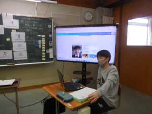 進学する入善中学校の英語の先生へ向けたビデオレターを作成しています。タブレットに向かって、自分の話した英語が本当に合っているかどうかを、Google翻訳機能を使って試しました。なかなかうまくいったようです。