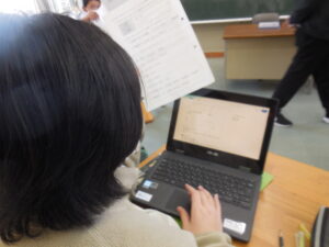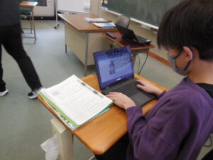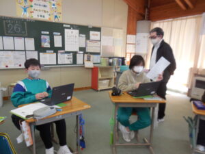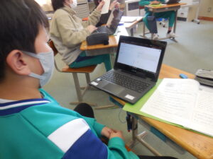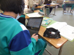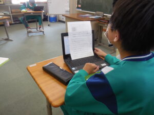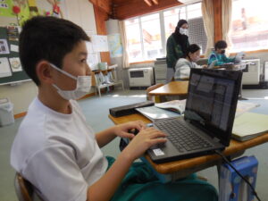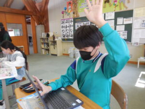 入善中学校の英語の先生に宛ててビデオレターを作成しているところです。自己紹介文を話し、タブレットの翻訳機能で判定してもらっています。また、そのビデオを取り込んでのポスターつくりにも取り組んでいます。ハイレベルな作業に圧倒されますが、子供たちの吸収の速さに驚くことしきりです。廣田先生の出されるツールが、子供たちには分かりやすく達成感を味わうことができます。完成版が楽しみですね。