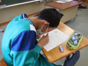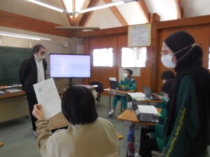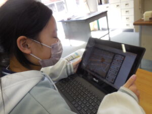 タブレットの画面で、宝を見付けるゲームです。しかし、その宝を見付けるためには、外国語専科の廣田先生の道案内(英語)を聞き取って、その通りに人間のイラストを動かさなければなりません。1問目は全員クリア。2問目はなかなか難しいようです。