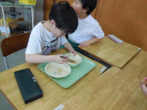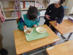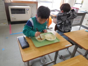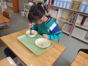 1年生が豆つまみをしていました。給食週間の取組でした。正しく橋を持って豆を移し替えるのは至難の業です。友達の応援を受けながらがんばっていました。