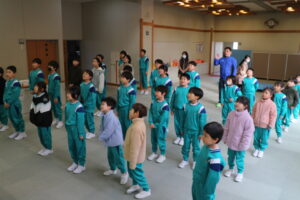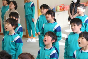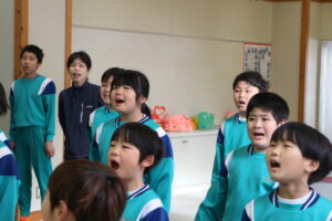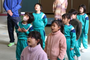 の2曲を歌いました。朝活動に歌い、外に大きな虹がかかるくらい大きな響く歌声でした。歌詞も覚え、子供たちが口を大きく開けて必死に歌う姿を見ると・・・泣けてきそうです。