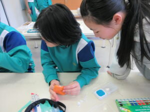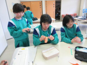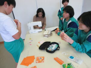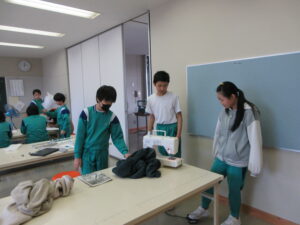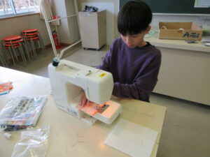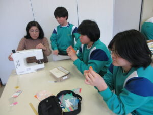 5年生はエプロン、6年生はコースターを製作しています。ランチョンマット、ナップザックが仕上がったのでこれで家庭科の製作は終了かと思いきや、最後までがんばっています。6年生は、福澤先生に教えてもらいながら、ミシン担当、アイロン担当など分業制で行っています。このコースター、秘密のミッションのようです・・・。
