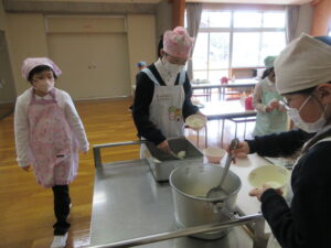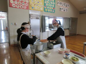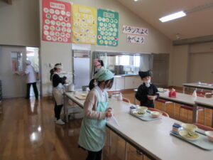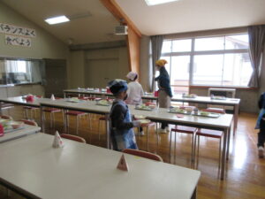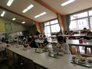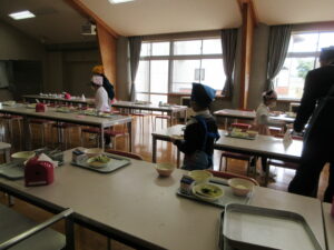 ランチルームでの給食がスタートしました。進級して、仕事がレベルアップしました。盛り付けや配膳を縦割り班で協力して上手に行っています。モリモリ食べてパワーアップしましょう。驚いたのは、とても静かに食事をしていることです。新年度、給食主任の坂藤先生が給食のシステムやマナーを丁寧に指導してくださったお陰です。気持ちよく食事ができます。明日からは1年生も給食が始まります!楽しみですね。