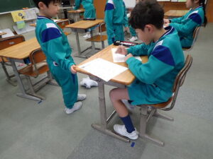 1・2年生。おみくじを引いていました。くじくじ係さんが作ったものです。教頭先生、なんと!「大大吉」でした。「きょうはいい日、たくさんうんどうしよう」と書いてありました。最高です!