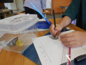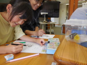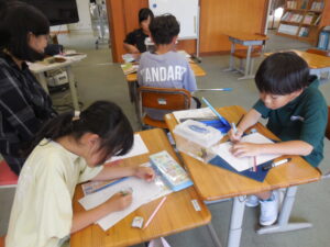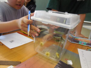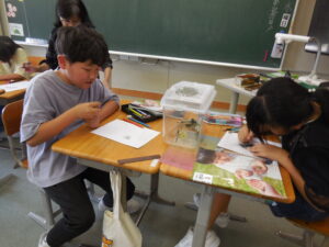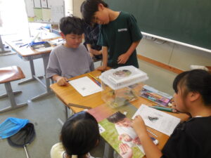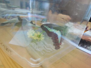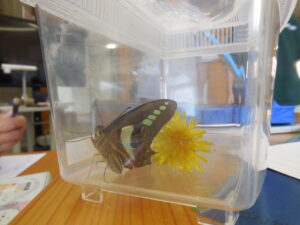 「先生、見て見て!!」教室をのぞくととてもうれしそうに虫かごを指さす3年生。虫かごの中にはきれいなアオスジアゲハがパタパタと羽をはためかせていました。「今日見たらチョウになっていた」そうです。「早く観察して逃がしてあげんと」なんと優しい3年生。ずっと見ていたいくらいきれいなアオスジアゲハでした。よかったね!
