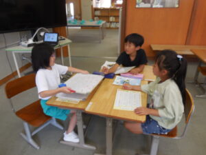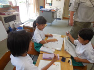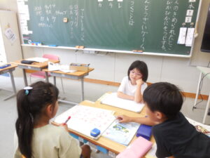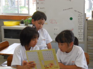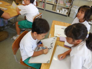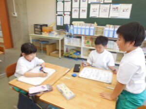 「レ」「ラ」「カ」のつくことばをグループになって考えています。考えた言葉をミニホワイトボードに書き綴っていました。からあげ、カレー、カステラ・・・。ワイワイ楽しく言葉集めをしています。カタカナ、漢字、そしてひらがな、たくさんの文字を学習する1年生です。濃密です。
