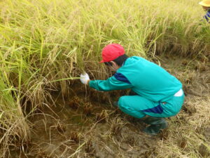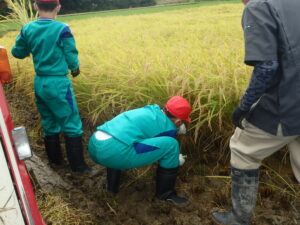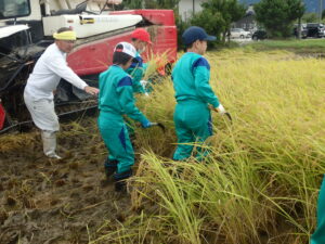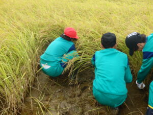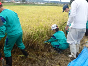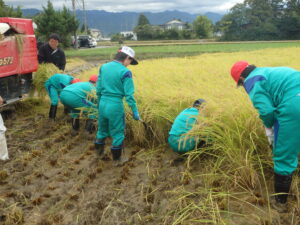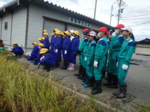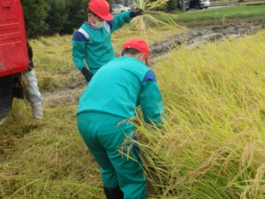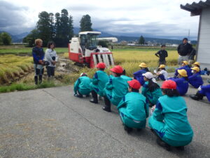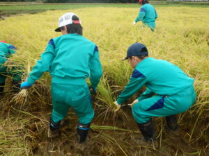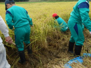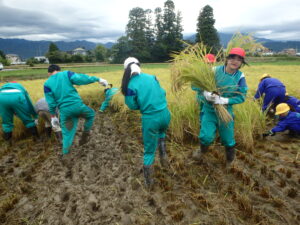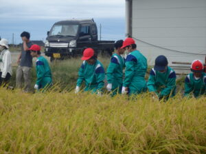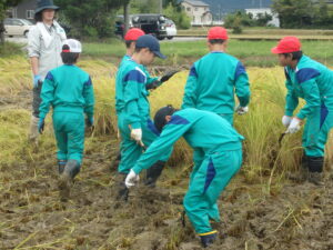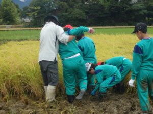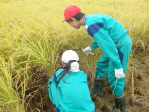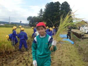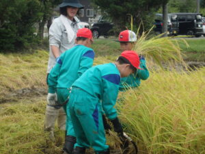 5・6年生が稲刈り体験活動を行いました。黒東小学校の5年生と一緒に行いました。JAみな穂 営農指導員の方々に稲の刈り方を指導していただきました。稲をつかみ、鎌を引いて刈るとよいと教えてもらいました。子供たちは、初めて体験する子がほとんどでしたが、楽しく刈ることができました。泥にはまったときには、友達を助け、協力して稲を刈りました。JAみな穂の皆様、ご協力いただきありがとうございました。