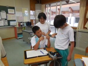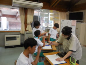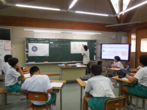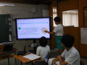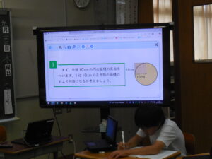 円の面積・・・その前に5年生で学習した円周率や円周の求め方を確認していました。しかし・・・結構忘れているものです。みんなで確認しながら、長方形、正方形、台形、三角形などの面積の公式を確認し、円に突入です。「半径を1辺とする正方形の面積の何倍か」坂藤先生が課題を出しました。ヒントとなる図が描いてあるプリントを見ながら子供たちが悩みながらも友達と相談しながら粘り強く考える姿がありました。坂藤先生の熱心な教材研究と丁寧な準備がすばらしいです。子供たちとの掛け合いも明るく、難しい内容ながらも子供たちは楽しく学習に取り組んでいます。最後には「本当の面積知りたい」「公式ってどんなん?」という意見が出ました。「わくわく」がいっぱいの学習になりそうですね。
