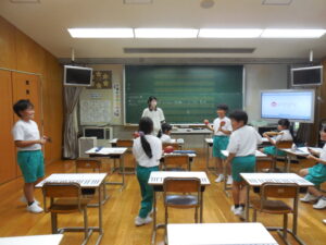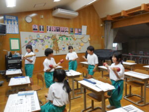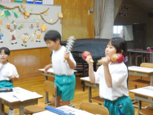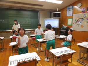 行事 ピーナッツベンダー 3・4年生音楽【9月26日】 2025年9月26日 ひばり野小 音楽室でノリノリで踊っている・・・。手には楽器。マラカス、ギロ、クラベス、すず。実に楽しそうです。音楽に合わせて演奏するのですが、自然と体が動いちゃう。これこそ音楽の真髄です。