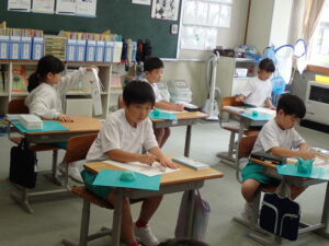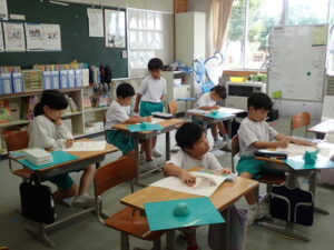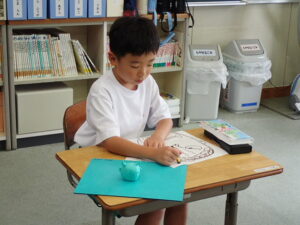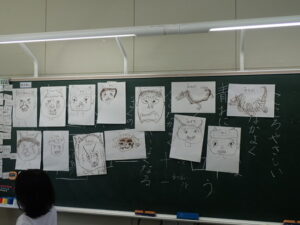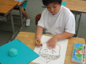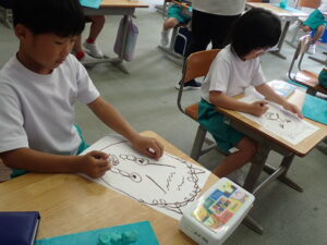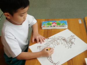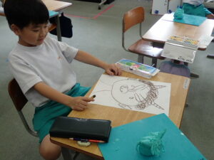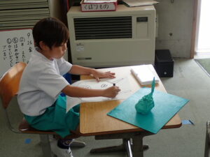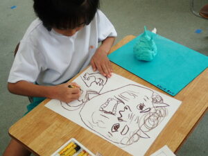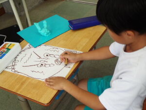 行事 想像して描こう 1・2年生【9月26日】 2025年9月26日 ひばり野小 図画工作の時間。お話を聞いて、想像したことを絵に描きます。 1年生は「ないたあかおに」2年生は「りゅうのめのなみだ」の話を聞きました。鬼やドラゴンを画用紙いっぱいにのびのびと描いています。なかなか迫力があります。