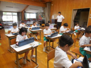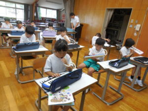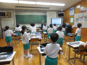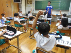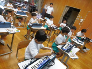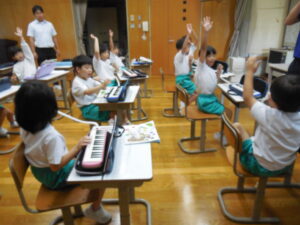 「ドレミのうた」と「かえるのうた」の鍵盤ハーモニカを演奏しています。2年生と一緒に学習している1年生は、低いドから高いドまでマスターして、一生懸命メロディを引いています。かなりハイレベルです。かえるのうたは追いかけっこをして演奏できます。自信満々です。