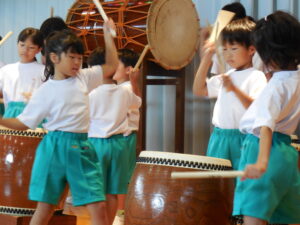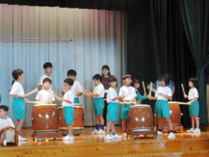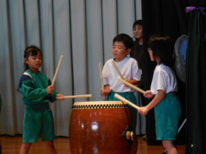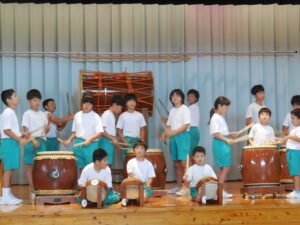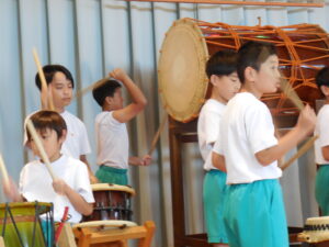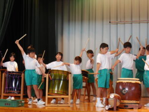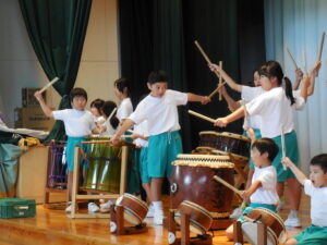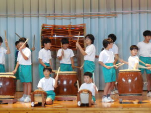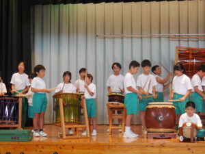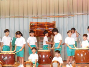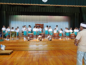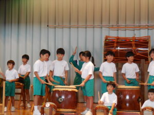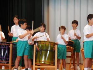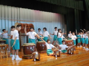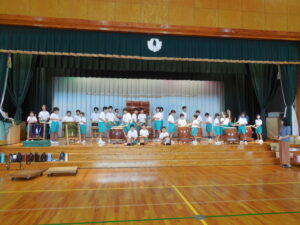 創立30周年式典に披露する舟見本陣太鼓。全校練習は1学期の7月から久しぶりでした。「覚えている人?」う~ん、少しでした💦今回からは、本番同様に太鼓をセッティングして行いました。ステージに立つと一段とりりしくかっこよかったです。次回はまた違うリズムも登場するらしく、難しくなっていきます。しかし、子供たちの大きなかけ声と力強い太鼓の音色が体育館に響き、元気いっぱい頑張りました。指導してくださった大家さん、西尾さんいつもありがとうございます。