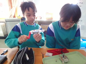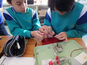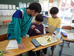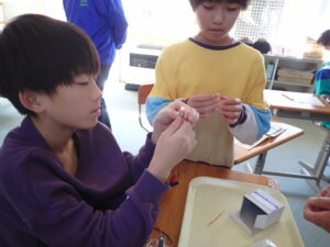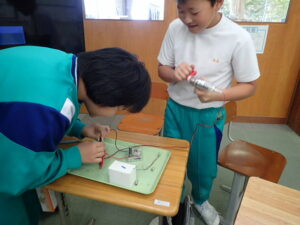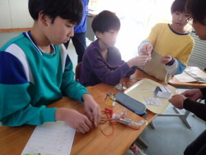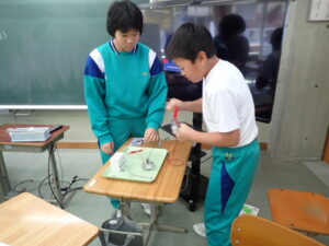 ウィーンウィーンと6年教室から音が聞こえてきます。見ると、子供たちが蓄電器を回しています。蓄電器でためた電気を電極をつないでいろいろ試していました。オルゴールや豆電球、発光ダイオードなど。オルゴールの音色が聞こえたり、豆電球が点灯したりしたら大喜び。自分で作った電気が使われていることを実感しました。