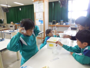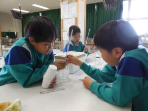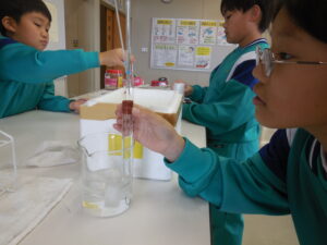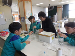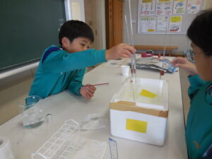 4年生、理科室で実験中です。「水の体積の変化を調べています」水を温めると体積はどうなるかを石原先生と一緒に実験しました。温めるとガラス管の中の水の水位が上がり、氷で冷やすと水位が下がっていきます。「見とって、見とって」とうれしそうに実験を見せてくれました。これでしっかり頭に入りましたね。