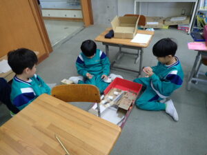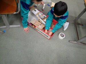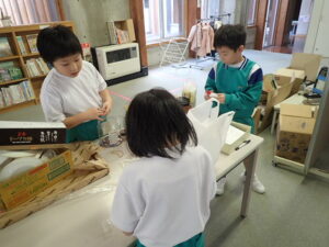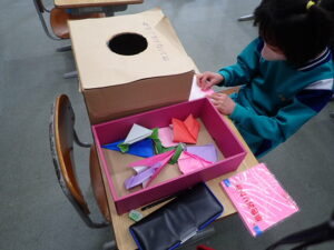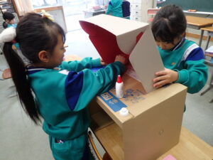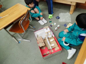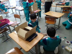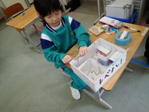 行事 ひばりっ子冬まつりに向けて 1・2年生 2025年12月2日 ひばり野小 管理G ひばり野保育所の子供たちを招待しての冬まつりの準備が進んでいます。1年教室前にはたくさんの箱があります。そこから自分で選んでお店の準備をしています。さかなつり、おもちゃやさん、迷路など、おもてなしの気持ちで一生懸命です。