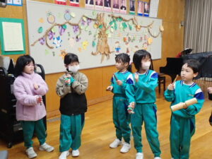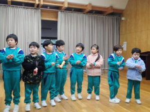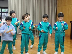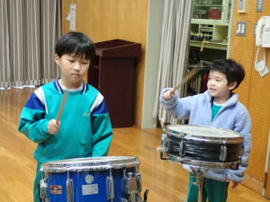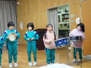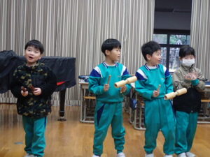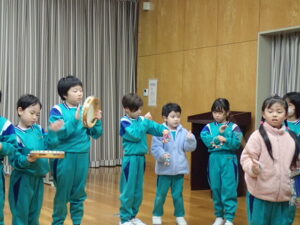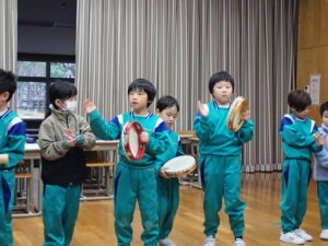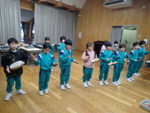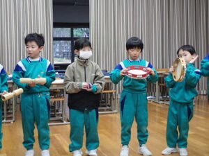 行事 楽器演奏を楽しむ 1・2年生【12月2日】 2025年12月2日 ひばり野小 管理G 音楽の時間。「かぼちゃ」の歌を歌いながら、いろいろな楽器の演奏を楽しんでいます。リズムに合わせて軽快に合奏しています。カスタネット、タンバリン、小太鼓、トライアングル、ウッドブロック、クラベスの6つをそれぞれ体験中です。お気に入りの楽器はどれかな?