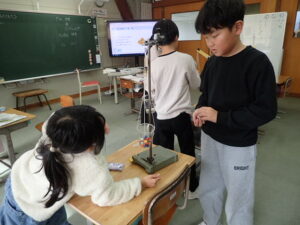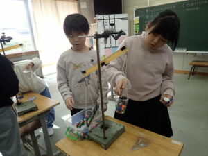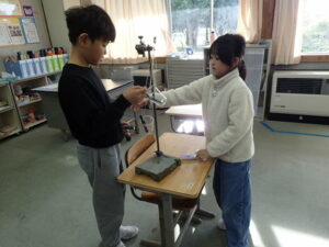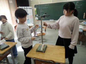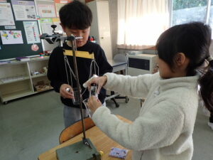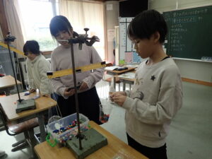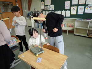 3年生の算数は重さの学習です。身の回りのいろいろなものの重さを比べました。三角定規、コンパス、単三乾電池・・・手で持って比べましたが、なかなかわかりにくいものです。そこで手作り天秤の登場。「分かりやすい」「でもたくさんあったら分からんくなる」そうですよね・・・。