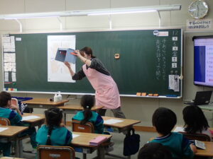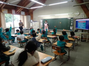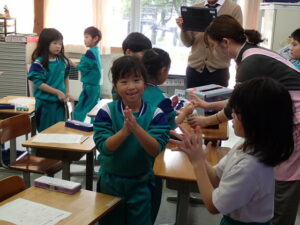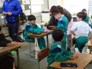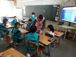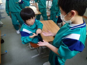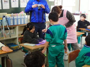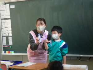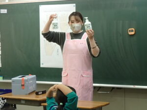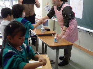 12月5日(金)1・2・3年生を対象として、「養護教諭の村中先生による手洗い教室が行われました。「手洗いチェッカー」なるクリームを塗って、手の汚れを調べます。まず、一人の子供がクリームを塗ります。そしてみんなで音楽に合わせてじゃんけんゲームをしました。あいこだったら握手をします。何と、クリームを塗った子供と握手した子はしっかり反応しています。それは村中先生が光を当てて調べることができます。