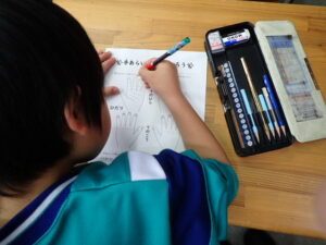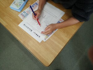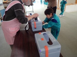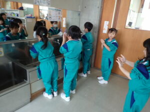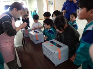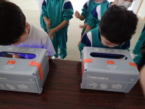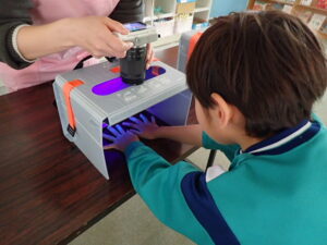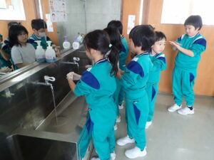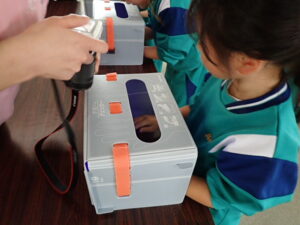 そのあと、全員がクリームを塗り、手洗いをしました。きれいに洗ったはずなのに・・・判定ボックスに手を入れると、しっかり汚れが残った証拠(白く光る)があります。「爪のところが白かった」「手のひらもいいがに洗ってなかった」と実感していました。色々な感染症が流行する季節です。手洗いをしっかりして予防したいものです。子供たちにとっては、日頃の手洗いを見直したり、清潔に心掛けたりするよい学習となりました。