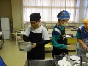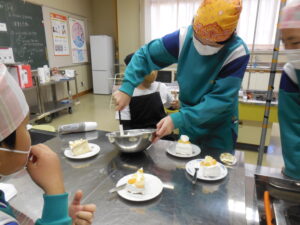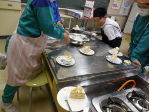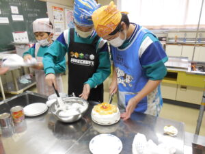 調理クラブは、クリスマスケーキを作りました。スポンジにクリームを塗り、フルーツを飾りました。誕生日の友達には、チェリーのサービスがありました。豪華な最終回でした。