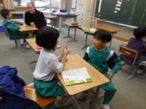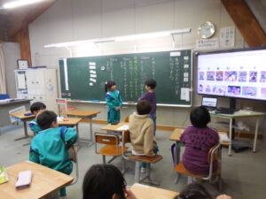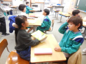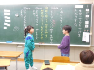 1年生の国語の時間。話す・聞くの学習です。二人ペアになって話をして質問したり答えたりします。「どんなお菓子が好きですか」「わたしは~が好きです」「そうして好きなんですか?」・・・。というように進めます。感心するのは、担任の清水先生が「はい、ペアになって」と言うと、すぐに相手を見付けて話し始めます。次のテーマになって「次は違う人とするよ」と言うと、またさっと動いて活動を始めます。「~ちゃんやろう」というように、だれとでも仲良く活動できる1年生に成長を感じます。もちろん、話し方聴き方も笑顔でできる子供たちにうれしくなります。