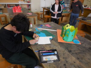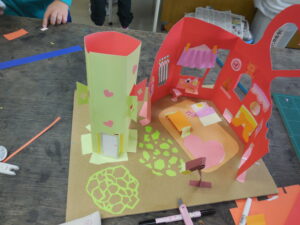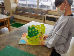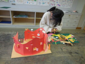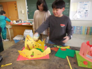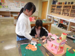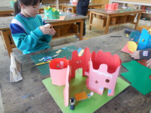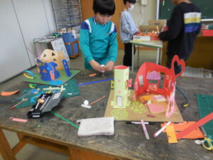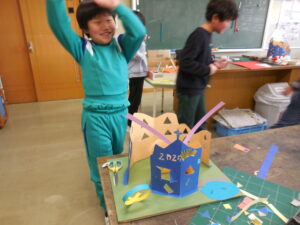 図画工作の時間、2学期から取り組んでいる「カッター名人になろう」ですが、名人を通り越して神の域に達していました!お城や家を作っているのですが、どんどんバージョンアップしていました。家の中には机やテーブル、ごちそう、外には鯉を飼っている池やブランコ・・・。テーマパークです。想像を膨らませながら創り上げていく子供たちに感心します。すばらしいです!