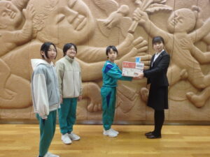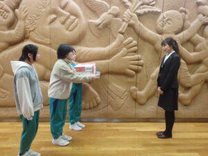 行事 赤い羽根共同募金【1月19日】 2026年1月19日 ひばり野小 管理G 社会福祉協議会の桑守さんに来校いただき、昨年末に校内で集めた募金を渡しました。ボランティア活動に取り組んできた「なんでも委員会」の代表が全校児童の思いをこめて渡しました。