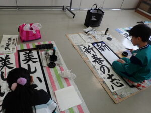 行事 書初め練習【1月22日】 2026年1月22日 ひばり野小 管理G 書初め練習2回目です。県大会出品作品の提出に向けてがんばっています。前回よりも数段上達しました!線の美しさ、力強さがアップです。月曜日が最終です。