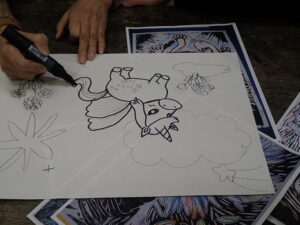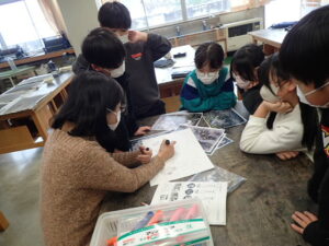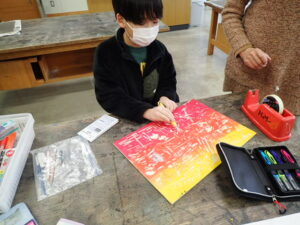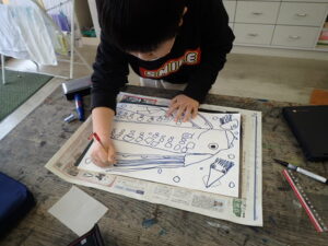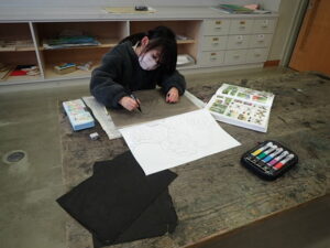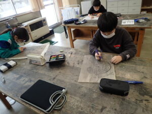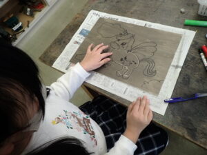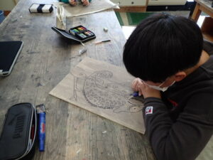 彫刻刀の使い方をしっかり学んだ3・4年生。いよいよ版画の下絵を掘り始めました。下絵を板に写し、彫る線を確認してから始めました。指を彫らないように気を付けます。彫刻刀で掘り進む前方に手を置かない、に気を付けて彫っていました。彫って刷ったイメージが捉えにくいのですが、福澤先生のスーパー指導によりきっと素晴らしい作品になると思います。子供たちも彫刻刀で彫るのを楽しんでいます。