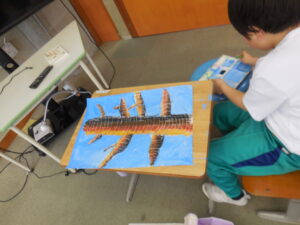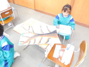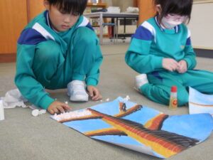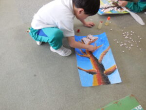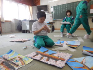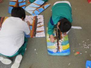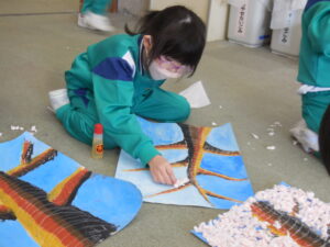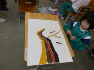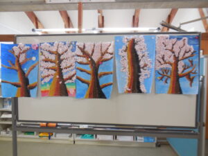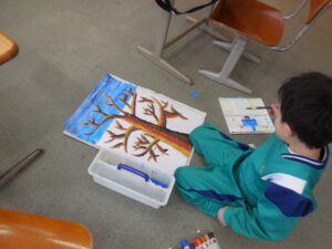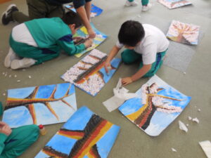 1・2年生の図画工作の時間。グラデーションを活かした木を製作中です。進化してきた木に花が咲き始めました。トイレットペーパーを丸めて一つずつ糊で貼っています。冬真っ最中ですが、桜色の花を見ると春を感じます。素敵ですね・・・。