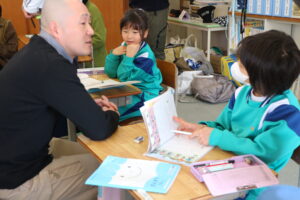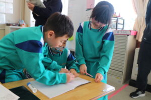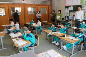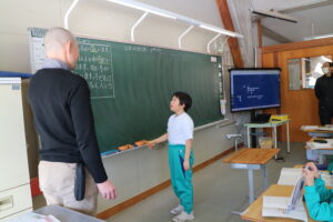 校内研究授業を行いました。1年生の算数科の授業です。「たしざんとひきざん」の単元で、問題を図に描いて考える学習でした。最初、図を描くことに難しさを感じる子供たちでしたが、清水先生の丁寧な説明を聞いたり、友達とペアになって話すことにより、図の描き方が分かり、それをもとにして式を立てることができるようになっていきました。進んで手を挙げて意見を言い、ノートを丁寧に書く子供たちの姿にこの1年の成長を感じました。