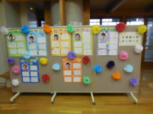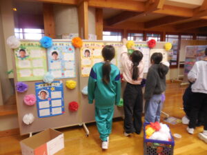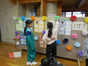 3・4年生は、6年生を送る会のテーマ看板とメッセージカードの作成を担当しています。1~5年生がテーマの文字を一人一文字描きました。なかなかの傑作です。メッセージボードも素敵に仕上がり3・4年生の仕上げも完璧です。6年生への気持ちが伝わる仕事ぶりです。