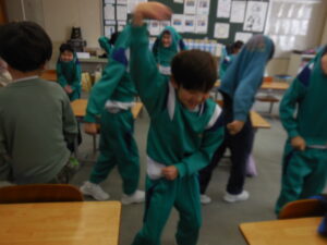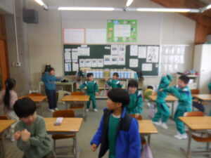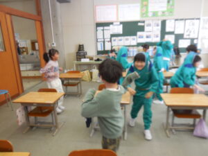 音楽の時間は鑑賞をしました。♪エンターテイナーを聴きました。「コマーシャルで聞いたことある」「知っとる」と馴染みの曲だったようです。身体表現が豊かな子供たちは、音楽が流れるとすぐ動き出します。しかし、ちゃんとリズムに合わせて踊ったり歩いたりしています。実に楽しそうです。「またやろう」「もっと踊りたい」とノリノリでした。