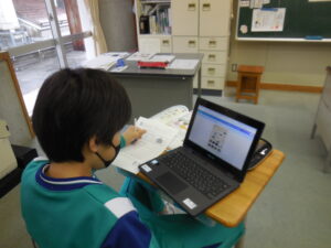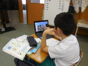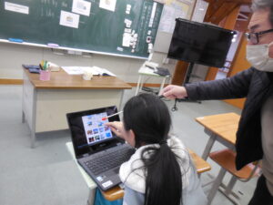 英語で書かれた入善町の地図を見ながら、自分のお気に入りの施設を書き込んで紹介しています。うるおい館の近くにレジャーランドを作ったり、公園の近くにゲームセンターを作るなど、自分のお気に入りを作ってタブレットで翻訳します。廣田先生とナディア先生と一緒に発話を学びながら楽しく学習しています。